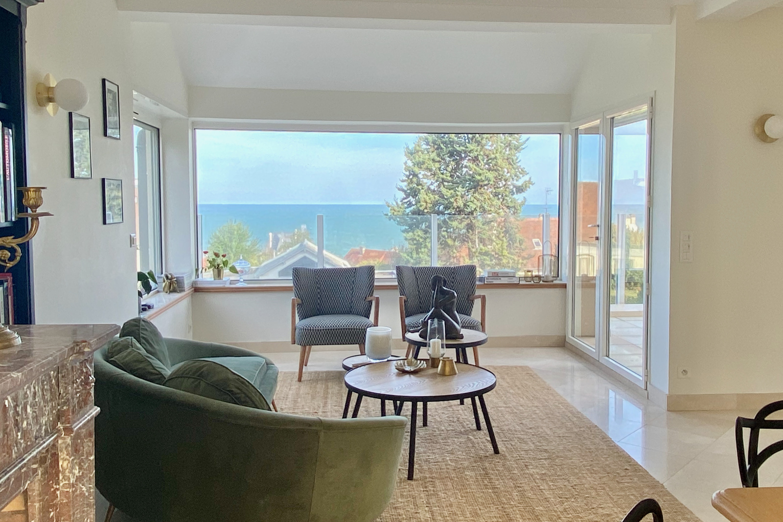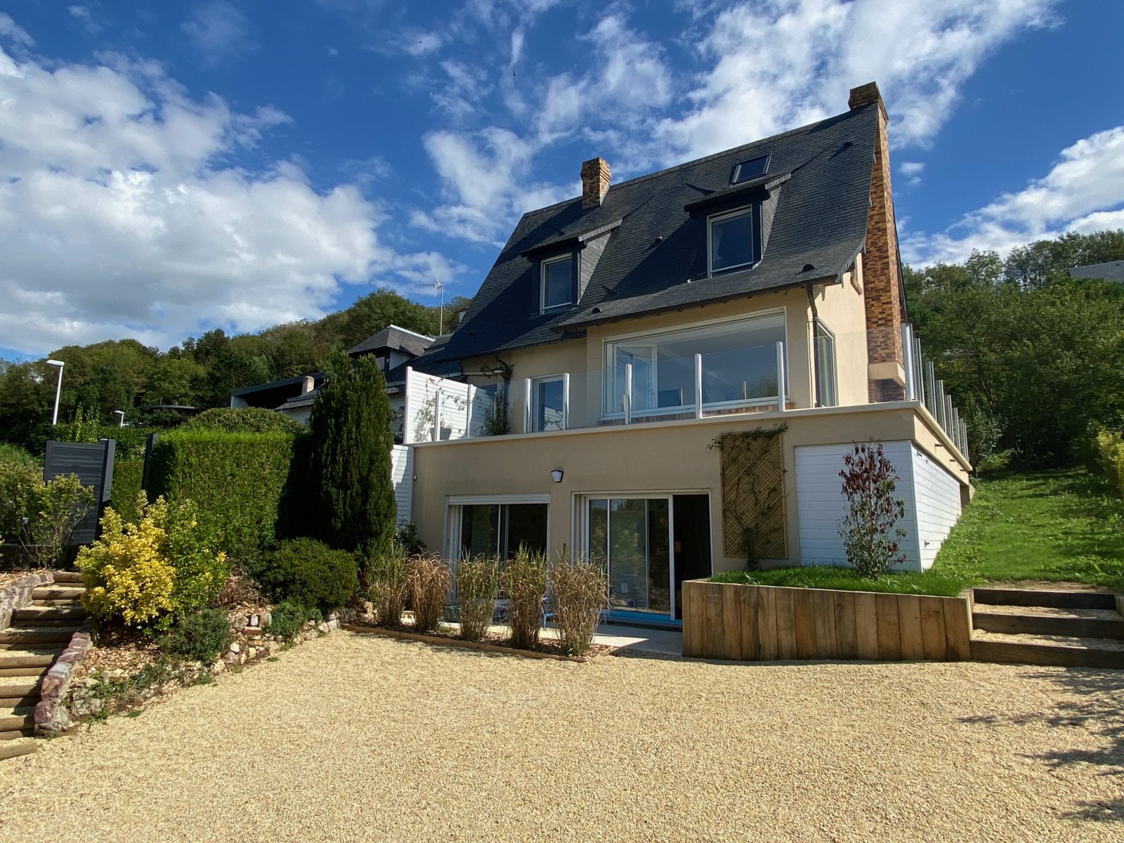 VENDU par OZENNE Immobilier - Vue mer panoramique, à 5min de Deauville | Profitant d'une superbe vue mer depuis les hauteurs de Bénerville sur mer, cette maison contemporaine de 8 pièces avec dépendance bénéficie d'un environnement calme à seulement 650m de la plage.